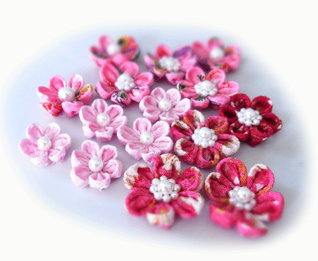 手元に大量に有る、リボン製のお花モチーフの存在。