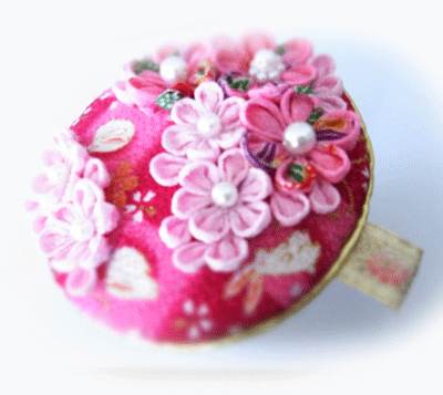 布地の花の模様を潰さないようにと配慮しつつ、つまみ細工を配置したら、左にばっかり寄りそう、滅茶苦茶偏りの激しい仕上がりになってしまいました。 (^-^;)>