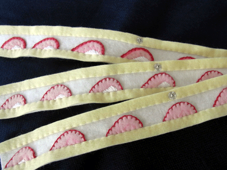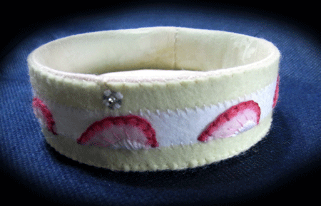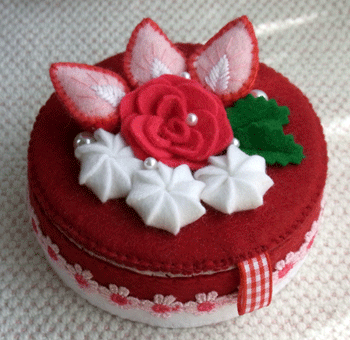 さてさて、画像のフェルトケーキ箱ですが。いろいろ作っていると、どうしてもフェルトの端切れが大量に出てきてしまうのですね。そこでそれを有効利用するべく、薔薇の花もどきを作ってみました。