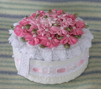 本当はこの縮緬細工のお花、和糊で形を整えたり貼り付けたりして作るものなのですが、どんなに頑張っても私にはその技が取得できず、仕方なく、チョコチョコ糸で縫い、木工用ボンドで貼り付けて、体裁を整えてます。