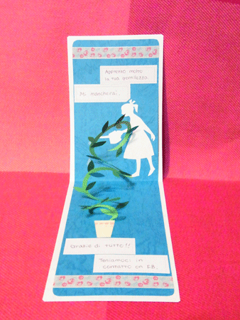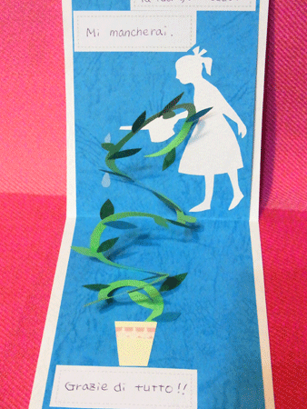 約9ヶ月間、イタリア語を教えてくれていた女の子が、明日イタリアに帰国するというので、お別れの際に渡すカードを、フェリシモのポップアップカードのキットを利用して作りました。